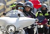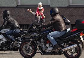 Мотоциклетный парад в честь открытия мотосезона на Дворцовой площади. Участники во время мотопарада по Дворцовой набережной.