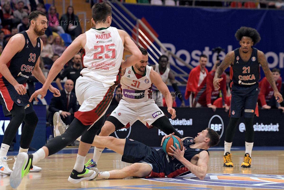1/2 finals of the VTB United Basketball League. Match between the teams of CSKA (Moscow) - "Lokomotiv - Kuban" (Krasnodar) at the stadium "Megasport". CSKA team player Alexander Evseev (left) during the match.