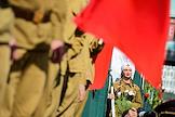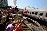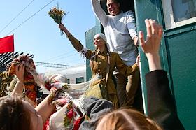 Церемония встречи ретро-поезда "Эшелон Победы" на вокзале "Новосибирск-Главный" в рамках праздничных мероприятий, посвященных 77-й годовщине Победы в Великой Отечественной войне. Участники во время театрализованной постановки встречи воинов-победителей на церемонии.