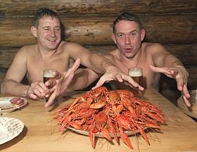 Артисты эстрады Александр и Валерий Пономаренко пьют пиво и едят раков после бани.