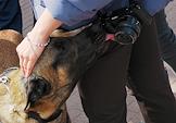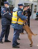 Театрализованное представление, посвященное 77-й годовщине Победы в Великой Отечественной войне, на Финляндском вокзале. Сотрудники охраны с собакой во время представления.