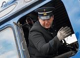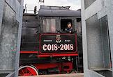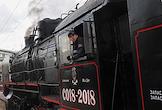Театрализованное представление, посвященное 77-й годовщине Победы в Великой Отечественной войне, на Финляндском вокзале. Машинист в кабине ретро-поезда "Серго Орджоникидзе".
