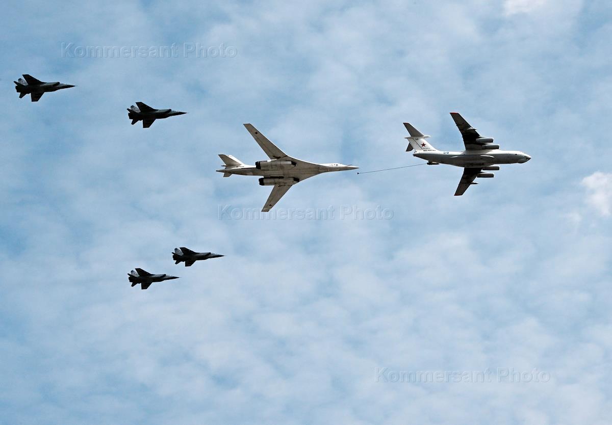 Генеральная репетиция Военного Парада на Красной площади, посвященного 77-ой годовщине Победы в Великой Отечественной войне. Самолет-заправщик Ил-78, стратегический бомбардировщик-ракетоносец Ту-160 и истребители-перехватчики МиГ-31БМ на генеральной репетиции воздушной части военного парада.