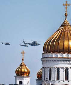 Dress rehearsal of the Military Parade dedicated to the 77th anniversary of the Victory in the Great Patriotic War, on Red Square. Military helicopters during the rehearsal of the air part of the military parade.