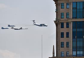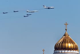 Dress rehearsal of the Military Parade dedicated to the 77th anniversary of the Victory in the Great Patriotic War, on Red Square. Il-78 refueling aircraft, Tu-160 strategic bomber and MiG-31BM fighter-interceptors at the final rehearsal of the air part of the military parade.