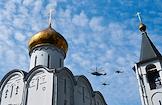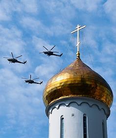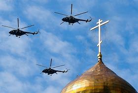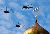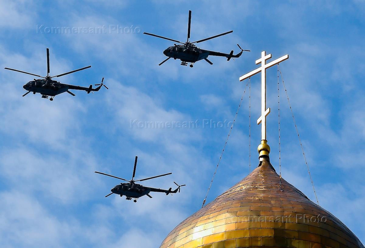 Dress rehearsal of the Military Parade dedicated to the 77th anniversary of the Victory in the Great Patriotic War, on Red Square. Mi-8 multi-purpose helicopters at the final rehearsal of the air part of the military parade.
