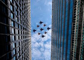 Dress rehearsal of the Military Parade dedicated to the 77th anniversary of the Victory in the Great Patriotic War, on Red Square. MiG-29 and Su-30SM fighters of the Russkie Vityazi and Strizhi aerobatic teams in the Cuban Diamond flight order at the final rehearsal of the air part of the military parade.