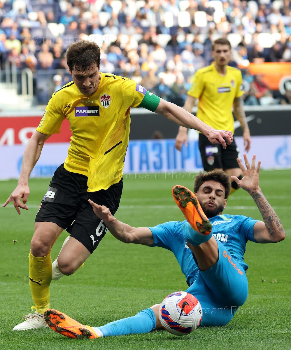 Российская Премьер-Лига (РПЛ). Тинькофф - Чемпионат России по футболу 2021/2022. 28-й тур. Матч между командами Зенит (Санкт-Петербург) – "Химки" (Московская область) на стадионе "Газпром Арена". Игрок команды "Химки" Гиа Григалава (в центре) во время матча.