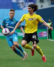 Российская Премьер-Лига (РПЛ). Тинькофф - Чемпионат России по футболу 2021/2022. 28-й тур. Матч между командами Зенит (Санкт-Петербург) – "Химки" (Московская область) на стадионе "Газпром Арена". Игрок команды "Химки" Гиа Григалава (в центре) во время матча.