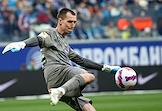 Российская Премьер-Лига (РПЛ). Тинькофф - Чемпионат России по футболу 2021/2022. 28-й тур. Матч между командами Зенит (Санкт-Петербург) – "Химки" (Московская область) на стадионе "Газпром Арена". Вратарь команды "Химки" Илья Лантратов во время матча.
