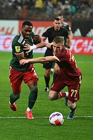 Российская Премьер-Лига (РПЛ). Тинькофф - Чемпионат России по футболу 2021/2022. 28-й тур. Матч между командами "Локомотив" (Москва) – "Рубин" (Казань) на стадионе "РЖД Арена". Игрок команды "Локомотив" Джирано Керк (слева) во время матча.