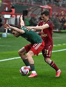 Российская Премьер-Лига (РПЛ). Тинькофф - Чемпионат России по футболу 2021/2022. 28-й тур. Матч между командами "Локомотив" (Москва) – "Рубин" (Казань) на стадионе "РЖД Арена". Игрок команды "Локомотив" Наир Тикнизян (слева) и игрок команды "Рубин" Георгий Зотов (справа) во время матча.