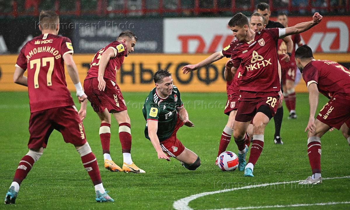 Российская Премьер-Лига (РПЛ). Тинькофф - Чемпионат России по футболу 2021/2022. 28-й тур. Матч между командами "Локомотив" (Москва) – "Рубин" (Казань) на стадионе "РЖД Арена". Игрок команды "Локомотив" Максим Петров (слева) во время матча.