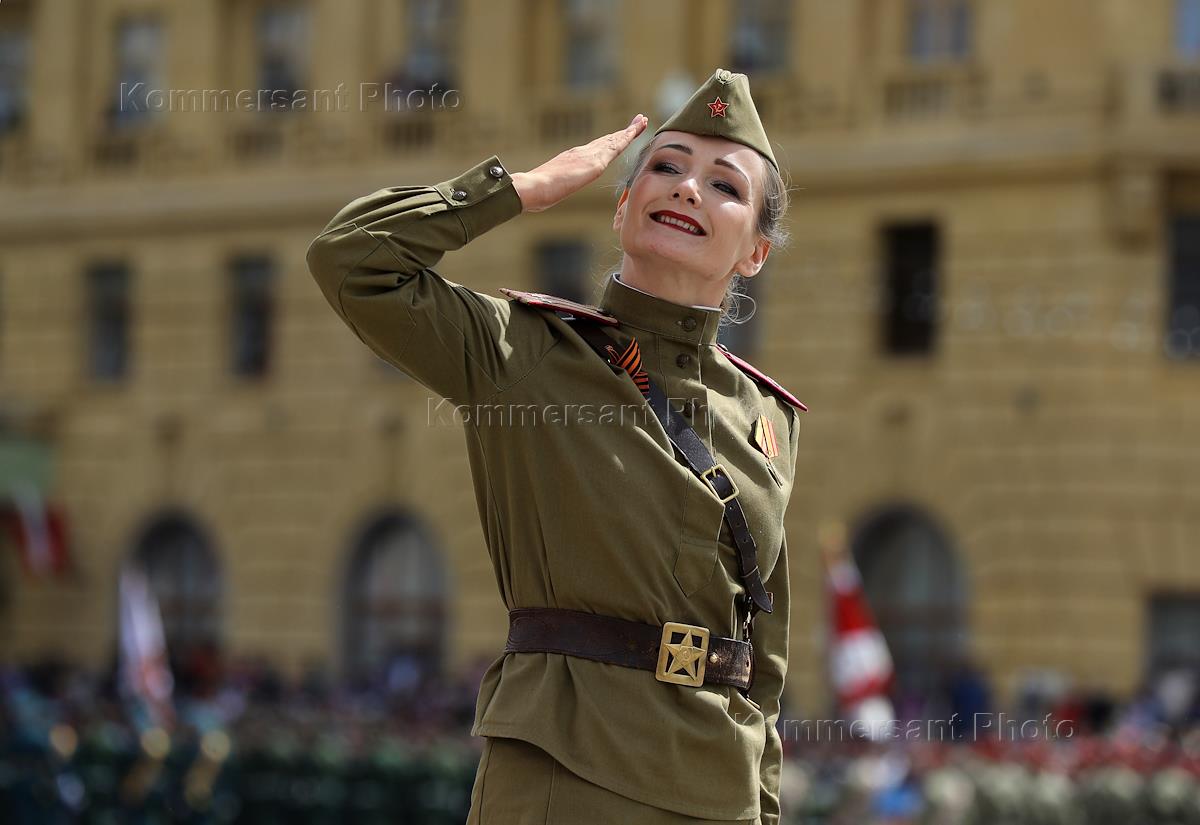 Военный парад в Волгограде, посвященный 77-ой годовщине Победы в Великой Отечественной войне. Военнослужащая во время парада.