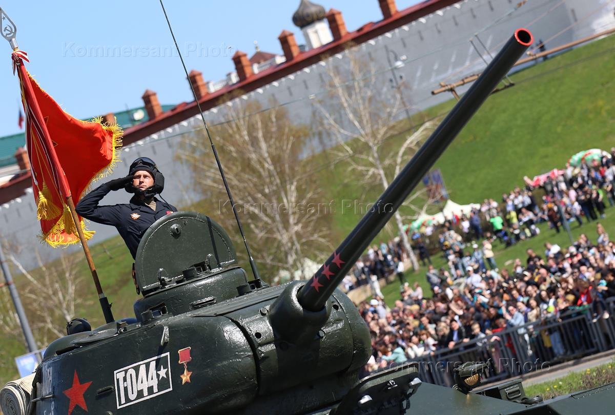 Военный парад на Площади Тысячелетия, посвященный 77-ой годовщине Победы в Великой Отечественной войне. Танк Т-34 "Колхозник Татарии" во время парада.