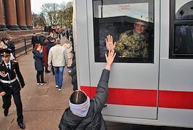 Празднование 77-ой годовщины Победы в Великой Отечественной войне. Акция памяти "Бессмертный полк". Девушка и военнослужащий во время прощания через стекло автомобиля.