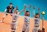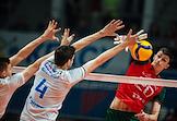 "Финал шести" мужского чемпионата России по волейболу в Центре волейбола. Второй полуфинал. Матч между командами "Локомотив" (Новосибирск) — "Зенит» (Казань). Игрок команды "Зенит" Артем Вольвич (в центре) и игрок команды "Локомотив" Ильяс Куркаев (справа) во время матча.