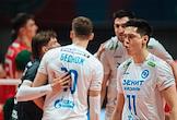 "Финал шести" мужского чемпионата России по волейболу в Центре волейбола. Второй полуфинал. Матч между командами "Локомотив" (Новосибирск) — "Зенит» (Казань). Справа налево: игроки команды "Зенит" Бартош Беднож, Артем Вольвич и Майка Кристенсон во время матча.