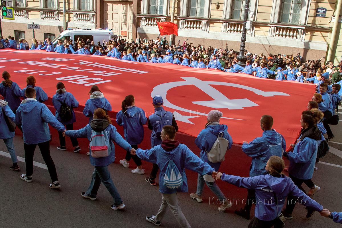 Празднование 77-ой годовщины Победы в Великой Отечественной войне. Волонтеры несут знамя Победы во Невскому проспекту во время акции памяти "Бессмертный полк".
