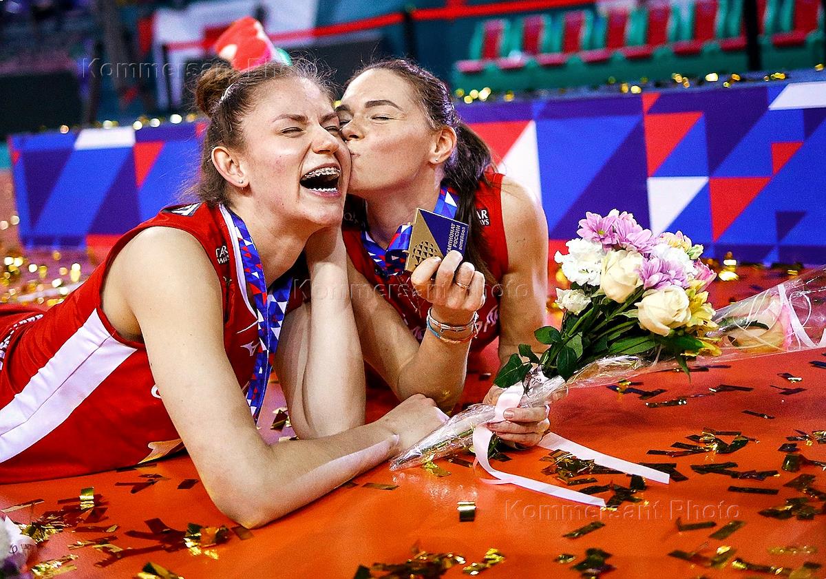 Чемпионат России по волейболу. Женщины. Финал. Матч между командами "Локомотив" (Калининград) - "Уралочка" (Екатеринбург) на арене Дворца спорта "Янтарный". Игроки команды "Локомотив" после победы в финале.