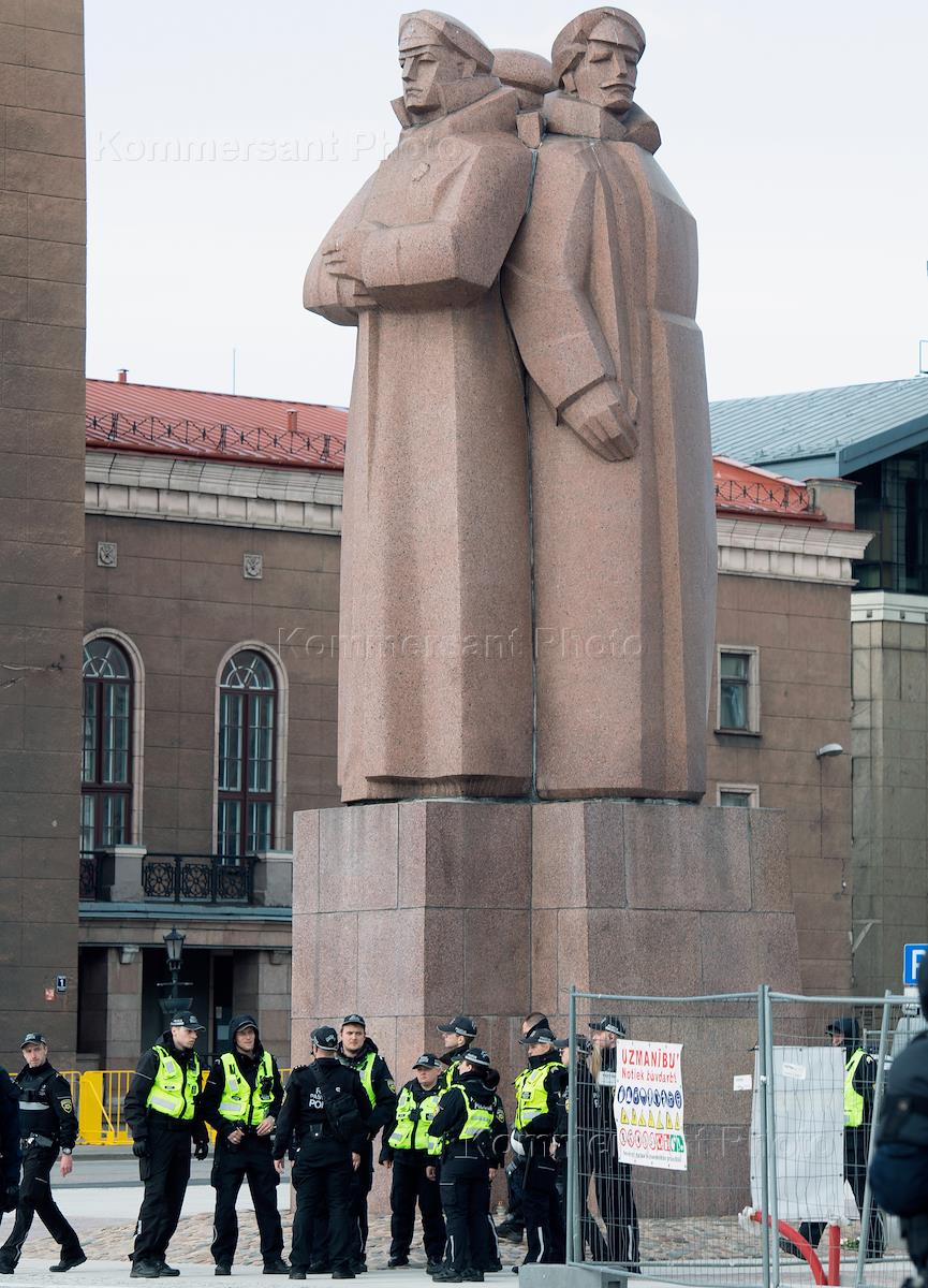 Митинг на Ратушная площадь против сноса памятника советским воинам — освободителям Латвии. Сотрудники полиции во время оцепления места проведения митинга.