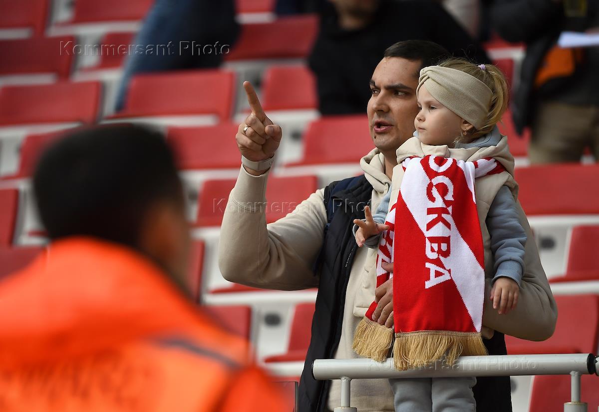 Российская Премьер-Лига (РПЛ). Тинькофф - Чемпионат России по футболу 2021/2022. 29-й тур. Матч между командами "Спартак" (Москва) – "Зенит" (Санкт-Петербург) на стадионе "Открытие Арена". Болельщики на трибуне перед матчем.