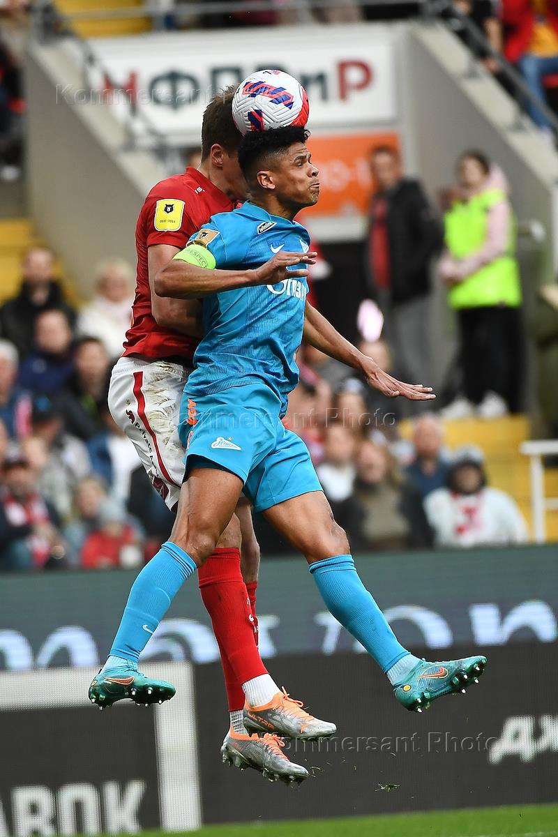Российская Премьер-Лига (РПЛ). Тинькофф - Чемпионат России по футболу 2021/2022. 29-й тур. Матч между командами "Спартак" (Москва) – "Зенит" (Санкт-Петербург) на стадионе "Открытие Арена". Игрок команды "Зенит" Дуглас дос Сантос (справа) и игрок команды "Спартак" Кристофер Мартинс Перейра (слева) во время матча.