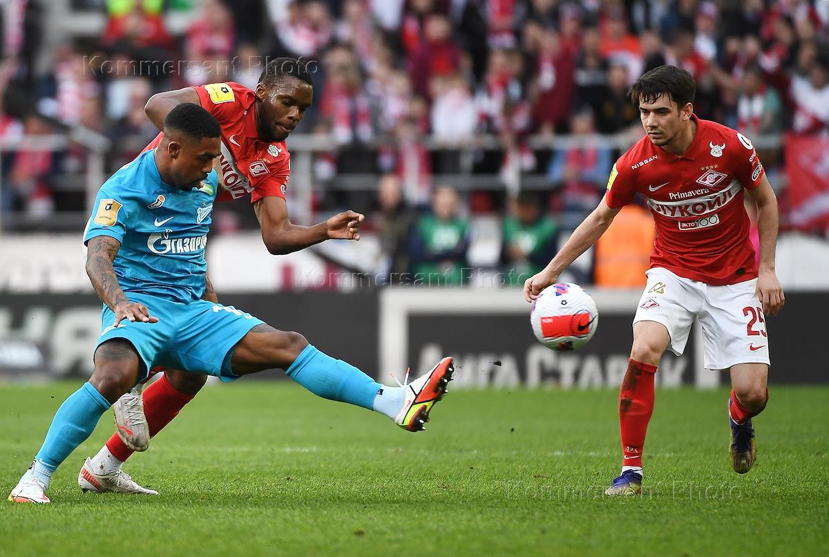 Российская Премьер-Лига (РПЛ). Тинькофф - Чемпионат России по футболу 2021/2022. 29-й тур. Матч между командами "Спартак" (Москва) – "Зенит" (Санкт-Петербург) на стадионе "Открытие Арена". Игрок команды "Зенит" Далер Кузяев (в центре) и игрок команды "Спартак" Квинси Промес (слева) во время матча.