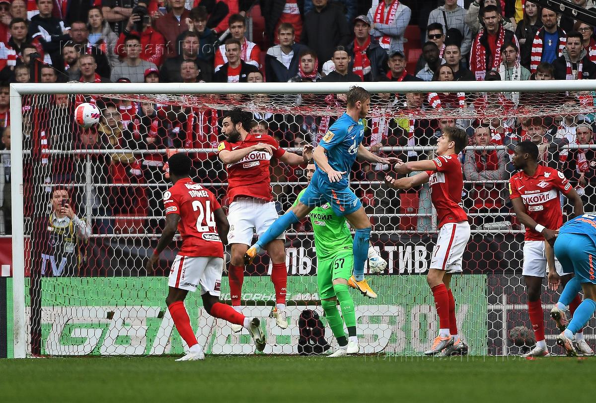Российская Премьер-Лига (РПЛ). Тинькофф - Чемпионат России по футболу 2021/2022. 29-й тур. Матч между командами "Спартак" (Москва) – "Зенит" (Санкт-Петербург) на стадионе "Открытие Арена". Вратарь команды "Зенит" Даниил Одоевский (второй слева) во время матча.