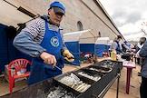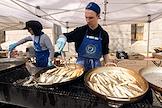Фестиваль корюшки на пляже Петропавловской крепости. Приготовление рыбы на свежем воздухе.
