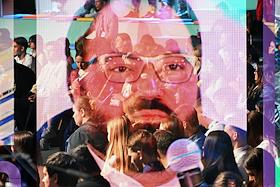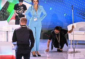 Федеральный Просветительский марафон "Новые горизонты" на ВДНХ. Министр цифрового развития, связи и массовых коммуникаций России Максут Шадаев (на экране) во время выступления на марафоне.
