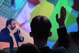 Федеральный Просветительский марафон "Новые горизонты" на ВДНХ. Министр цифрового развития, связи и массовых коммуникаций России Максут Шадаев во время выступления на марафоне.