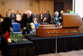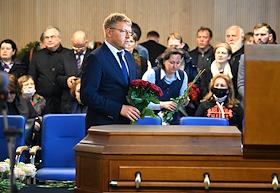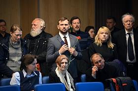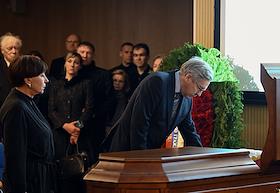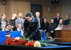 Церемония прощания с правозащитником, членом Совета по правам человека при президенте России Андреем Бабушкиным в Доме прав человека. Уполномоченный по правам человека в городе Москве Александр Музыкантский (в центре) на церемонии.