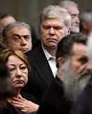 Церемония прощания с правозащитником, членом Совета по правам человека при президенте России Андреем Бабушкиным в Доме прав человека. Председатель Совета по развитию гражданского общества и правам человека при президенте России Валерий Фадеев (в центре) и главный редактор газеты "Московский комсомолец", глава Союза журналистов Москвы Павел Гусев (второй справа) на церемонии.
