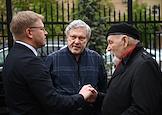 Церемония прощания с правозащитником, членом Совета по правам человека при президенте России Андреем Бабушкиным в Доме прав человека. Слева направо: председатель политической партии "Яблоко" Николай Рыбаков, председатель Федерального политкомитета "Яблока" Григорий Явлинский и сопредседатель Московской Хельсинкской группы, сопредседатель правозащитной фракции партии "Яблоко" Валерий Борщев после окончания церемонии.