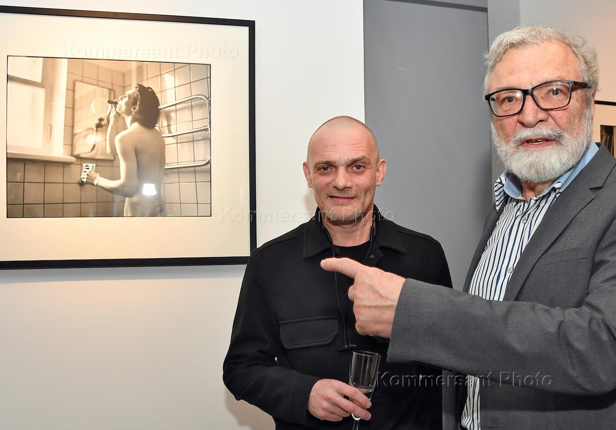 The opening ceremony of the exhibition "Reconstruction" by photographer Sergei Borisov, timed to coincide with the author's 75th birthday, at the Ruarts Gallery. Artist Kirill Preobrazhensky (left) and photographer Sergei Borisov (right) at the ceremony.