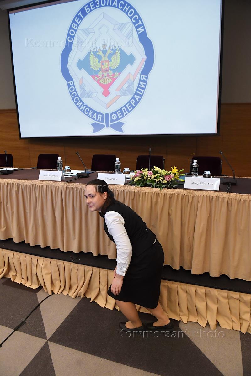 Conference of the Security Council of Russia in the hotel "Metropol". Genre photography. Preparation for the opening of the conference.