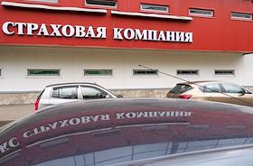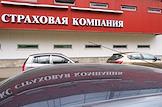Жанровая фотография. Надпись "Страховая компания" на здании и в отражении крыши припаркованного автомобиля.