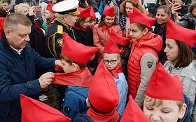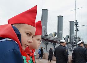 Празднование 100-летия Всесоюзной пионерской организации имени В.И.Ленина. Церемония принятие в пионеры на крейсере "Аврора".