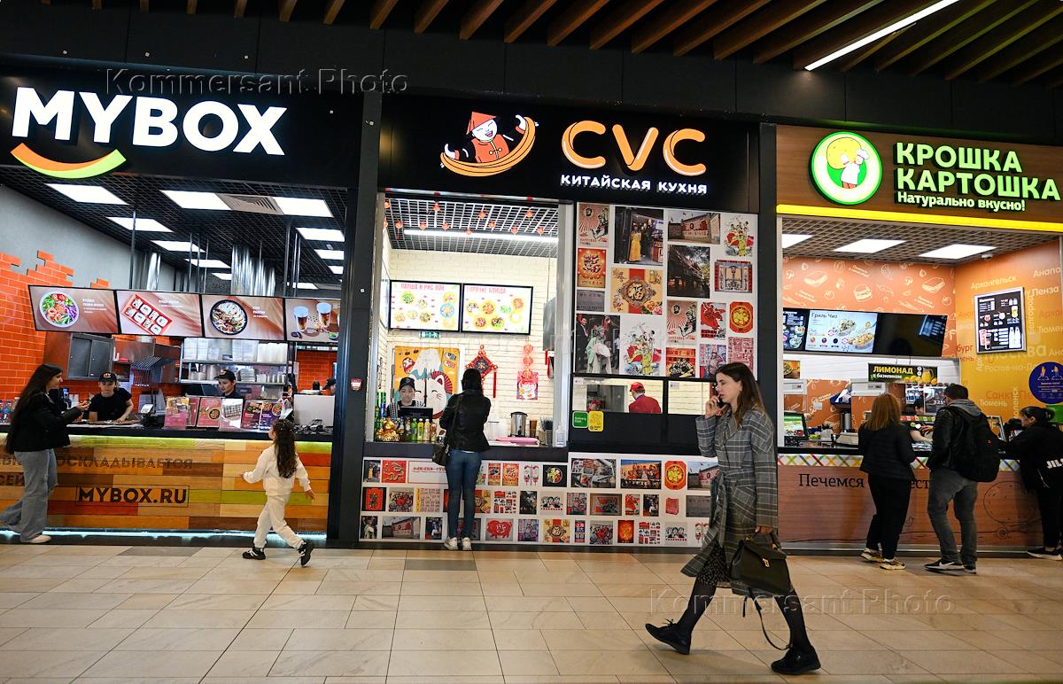 Покупатели в ресторанном дворике в Торгово-развлекательном центре (ТРЦ) "Саларис". Жанровая фотография. Стойка ресторана сети ресторанов домашнего питания "Теремок".