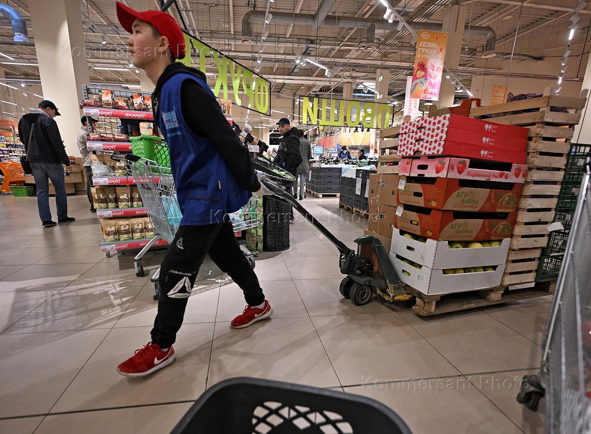 Работа торгово-развлекательного центра "Саларис". Сотрудник гипермаркета "Глобус" (Globus) в торговом зале.