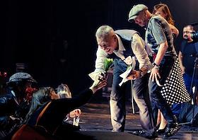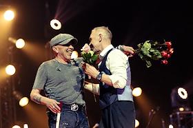 Музыканты Гарик Сукачев (справа) и Александр Ф. Скляр (слева) после выступления с концертной программой "Боцман и Бродяга" на сцене концертного зала "Крокус Сити Холл".
