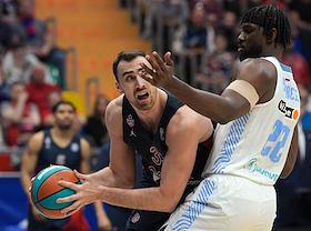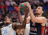 Единая лига ВТБ по баскетболу. Финал. Матч между командами ЦСКА (Москва) - "Зенит" (Санкт-Петербург) на стадионе "Мегаспорт". Игрок команды ЦСКА Никола Милутинов (слева) во время матча.