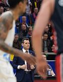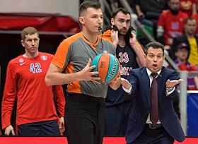 Единая лига ВТБ по баскетболу. Финал. Матч между командами ЦСКА (Москва) - "Зенит" (Санкт-Петербург) на стадионе "Мегаспорт". Главный тренер команды ЦСКА Димитрис Итудис (справа) во время матча.
