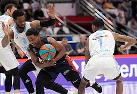 Единая лига ВТБ по баскетболу. Финал. Матч между командами ЦСКА (Москва) - "Зенит" (Санкт-Петербург) на стадионе "Мегаспорт". Игрок команды ЦСКА Уилл Клайберн (справа) и игроки команды "Зенит" Джордан Лойд (слева) во время матча.