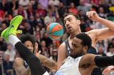 Единая лига ВТБ по баскетболу. Финал. Матч между командами ЦСКА (Москва) - "Зенит" (Санкт-Петербург) на стадионе "Мегаспорт". Игрок команды ЦСКА Никола Милутинов (слева) и игрок команды "Зенит" Алекс Пойтресс (справа) во время матча.