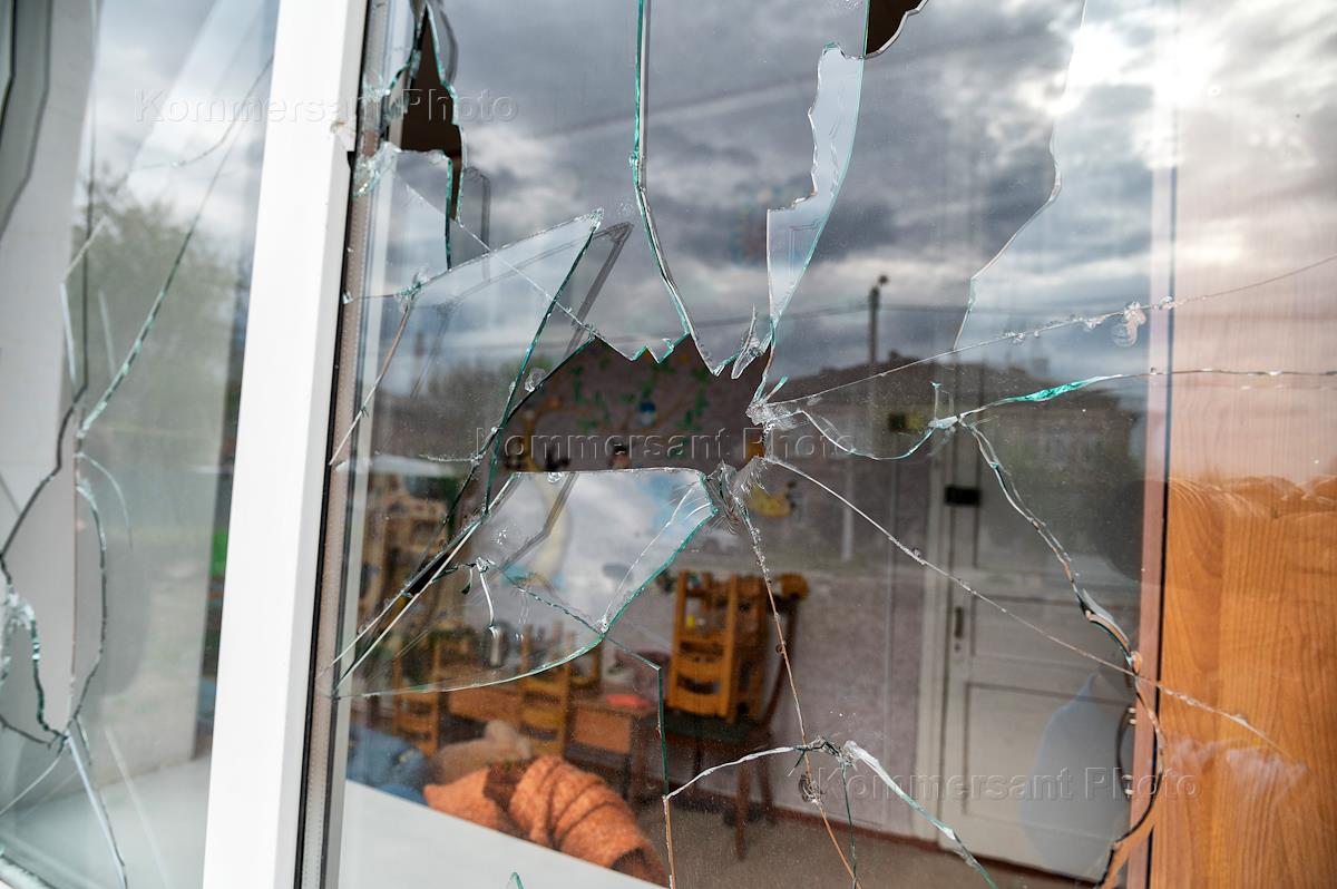 Consequences of mortar shelling by soldiers of the Armed Forces of Ukraine of the border village of Tetkino, Glushkovsky district, Kursk region. Glass broken by bullets in the windows of the building.