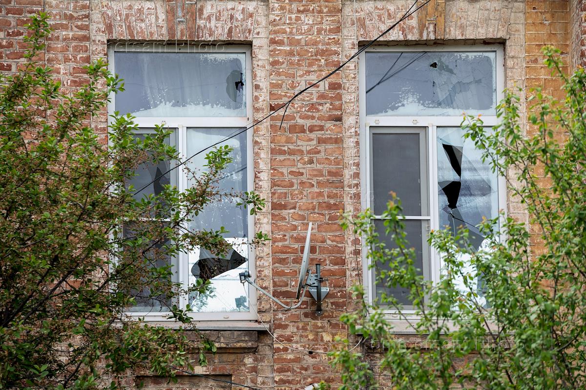 Последствия минометного обстрела бойцами Вооруженных сил Украины приграничного поселка Теткино Глушковского района Курской области. Разбитые пулями стекла в окнах здания.