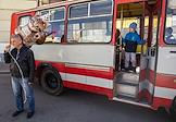 III Международный транспортный фестиваль SPbTransportFest. Жанровая фотография. Мужчина с воздушными шариками и мальчик в дверях выставочного автобуса.