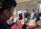 III Международный транспортный фестиваль SPbTransportFest. Жанровая фотография. Участницы фестиваля девушки бортпроводницы у стенда авиакомпании "Россия".